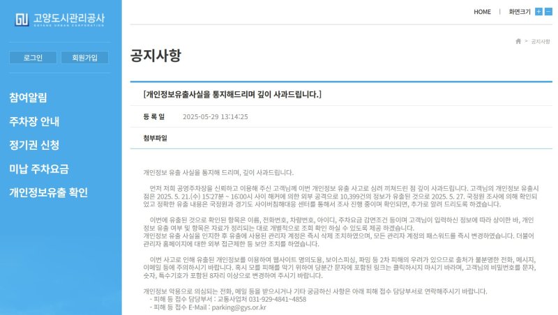 공사는 공영주차장 홈페이지에 이 같은 유출 사실과 사과문을 공지하고 2차 피해 주의 당부와 사고 접수 피해를 안내했다.