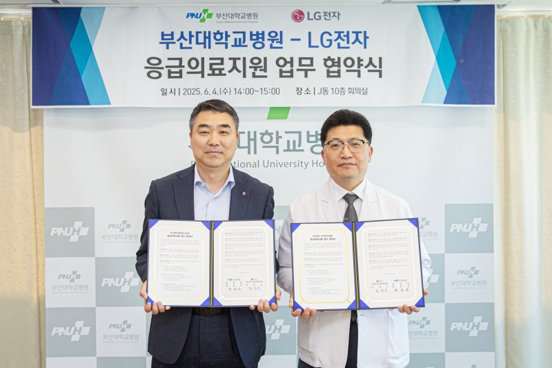 [부산=뉴시스]원동화 기자 = 부산대병원은 LG전자와 지난 4일 병원 J동 10층 회의실에서 외상환자 발생 시 신속한 이송과 적절한 진료를 지원하기 위한 '응급의료지원 업무협약(MOU)'을 체결했다고 5일 밝혔다.