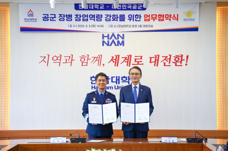 협약에 따라 한남대는 창업기업 육성을 위해 공군 창업경진대회 운영을 지원하는 한편 전역 후 창업을 희망하는 공군 장병에게 한남대에서 시행하는 창업지원 프로그램 지원 혜택 등을 부여할 예정이다.