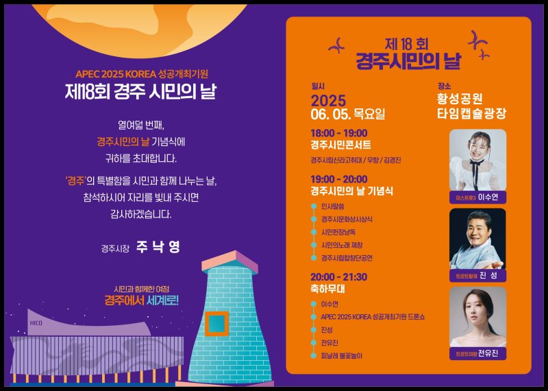 올해는 시민 참여 여건 등을 고려해 사흘 앞당겨 개최된 시민의 날 행사는 '시민과 함께한 여정, 경주에서 세계로'를 주제로 경주 발전을 이끌어온 시민들의 자긍심을 고취하고 APEC 2025 정상회의 성공 개최를 기원하는 시민 화합의 장으로 마련됐다.