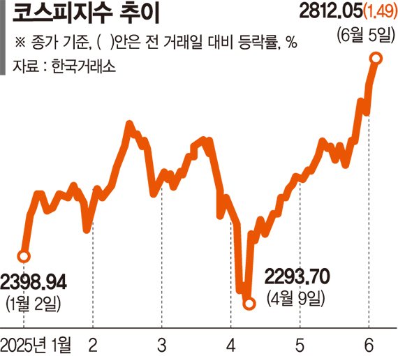 5일 코스피지수는 전 거래일보다 41.21p(1.49%) 오른 2812.05에 마감했다. 전일 71.87p 오른 것을 감안하면 이틀 만에 113.08p나 급등한 수치다.