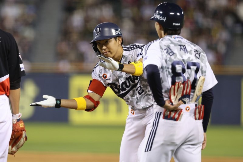 두산은 5일 잠실구장에서 열린 2025 신한 SOL 뱅크 KBO리그 KIA 타이거즈와 홈경기에서 1-1로 맞선 연장 10회말 김민석이 천금 같은 끝내기 안타를 터뜨려 2-1로 승리했다.