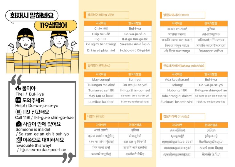이번에 제작된 119 생명어는 베트남어, 필리핀어, 인도네시아어, 네팔어, 캄보디아어, 방글라데시어 등 6개국 언어로 구성됐다.