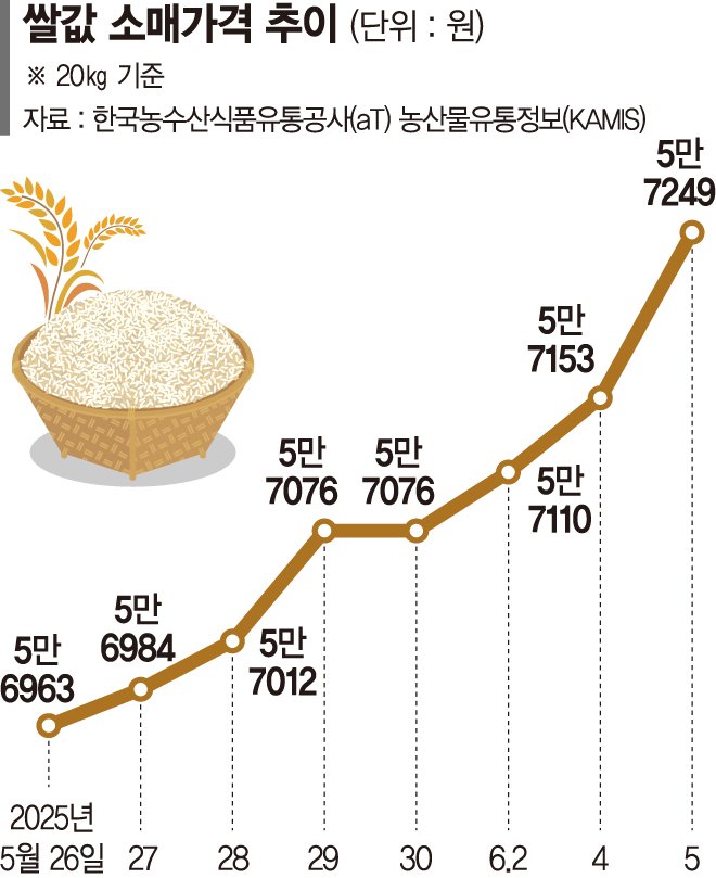 쌀 값은 지난 3월 이후 전년 대비 높은 가격을 형성하고 있다. 지난 2월 기준 2024년산 쌀값(20㎏, 소매가격)은 5만4438원으로 전년대비 2.5% 감소했지만, 3월 5만5237원으로 4.5% 상승했다. 4월에는 5만4831원(7.9%), 5월 5만6178원(4.1%)으로 올랐다. 6월 들어서는 상승폭이 10%에 육박하고 있다.