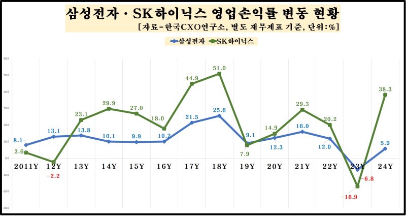 오일선 한국CXO연구소 소장은 "SK하이닉스의 지난해 영업이익률이 38.3%에 달한 반면, 삼성전자는 5.9%에 불과한 것이 결정적으로 작용했다"고 설명했다.