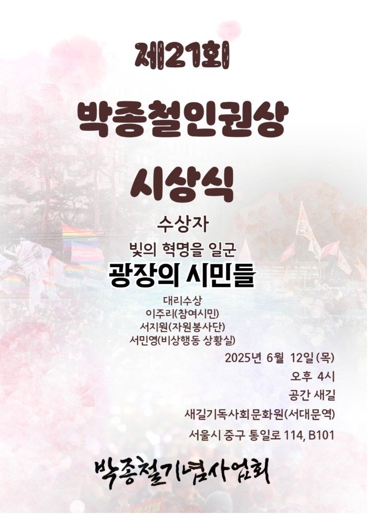 사업회는 "광장의 시민들은 2024년 12월 3일 긴박했던 내란의 밤 여의도 국회 앞에서 내란 진압의 주도적 역할을 해냈다"며 "이후로도 여의도에서 남태령까지, 한남동에서 광화문까지, 내란의 동조자들 하수인들이 민주주의에 대한 전복 시도를 하는 모든 곳에서 끊임없이 맞서 싸웠다"고 선정 이유를 밝혔다.