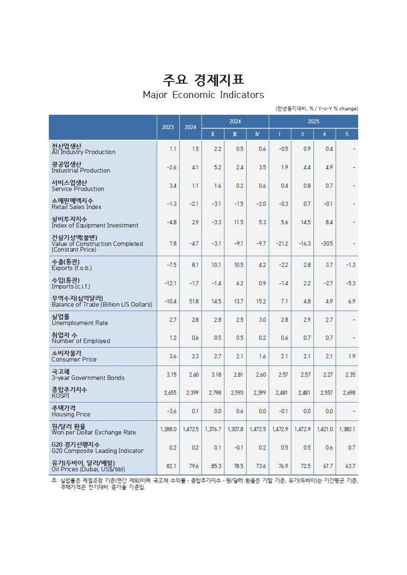 한편 반도체를 중심으로 제조업 생산은 양호한 증가세다. 4월 광공업생산 및 반도체 생산은 전년동기 대비 각각 4.9%, 21.8% 증가했다. 설비투자 역시 8.4% 증가했다. 반도체제조운용장비는 15.6%, 운송장비는 19.8% 등 증가했다. 반도체 관련 투자와 운송장비의 높은 증가세에 힘입어 양호한 흐름을 이어갔다.
