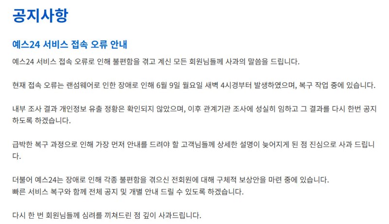 최 의원실 지적 이후 예스24는 ‘시스템 점검 안내’라고 했던 공지사항을 ‘예스24 서비스 접속 오류 안내’로 바꾸고 서비스 접속 오류가 랜섬웨어 공격에 따른 것이라고 바꿨다.