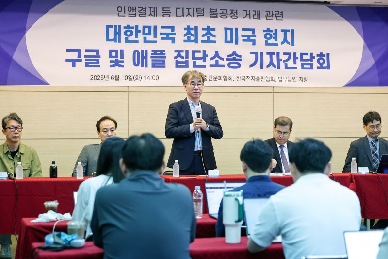 10일 출협 4층 강당에서는 윤철호 출협 회장을 비롯한 출협 관계자들과 한국전자출판협회 김환철 회장, 이번 소송 대리를 맡은 법무법인 지향 소속 변호사들이 참석한 가운데 지난달 23일 애플 및 이달 4일 구글을 상대로 집단소송을 제기하게 된 과정을 설명하는 기자간담회가 열렸다.