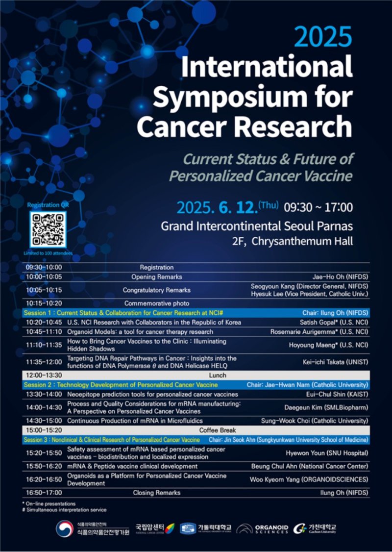 심포지엄에는 NCI 글로벌헬스센터장, NCI 치료제 개발 전문가를 비롯해 신의철 카이스트 교수, 안병철 국립암센터 박사 등 국내 암 연구 전문가 등이 연자로 참석한다.