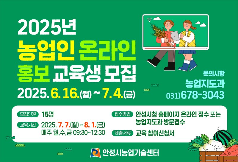 [안성=뉴시스] 정숭환 기자 = 경기 안성시는 오는 16일부터 7월 4일까지 '2025년 농업인 온라인 홍보 교육' 교육생을 모집한다.
