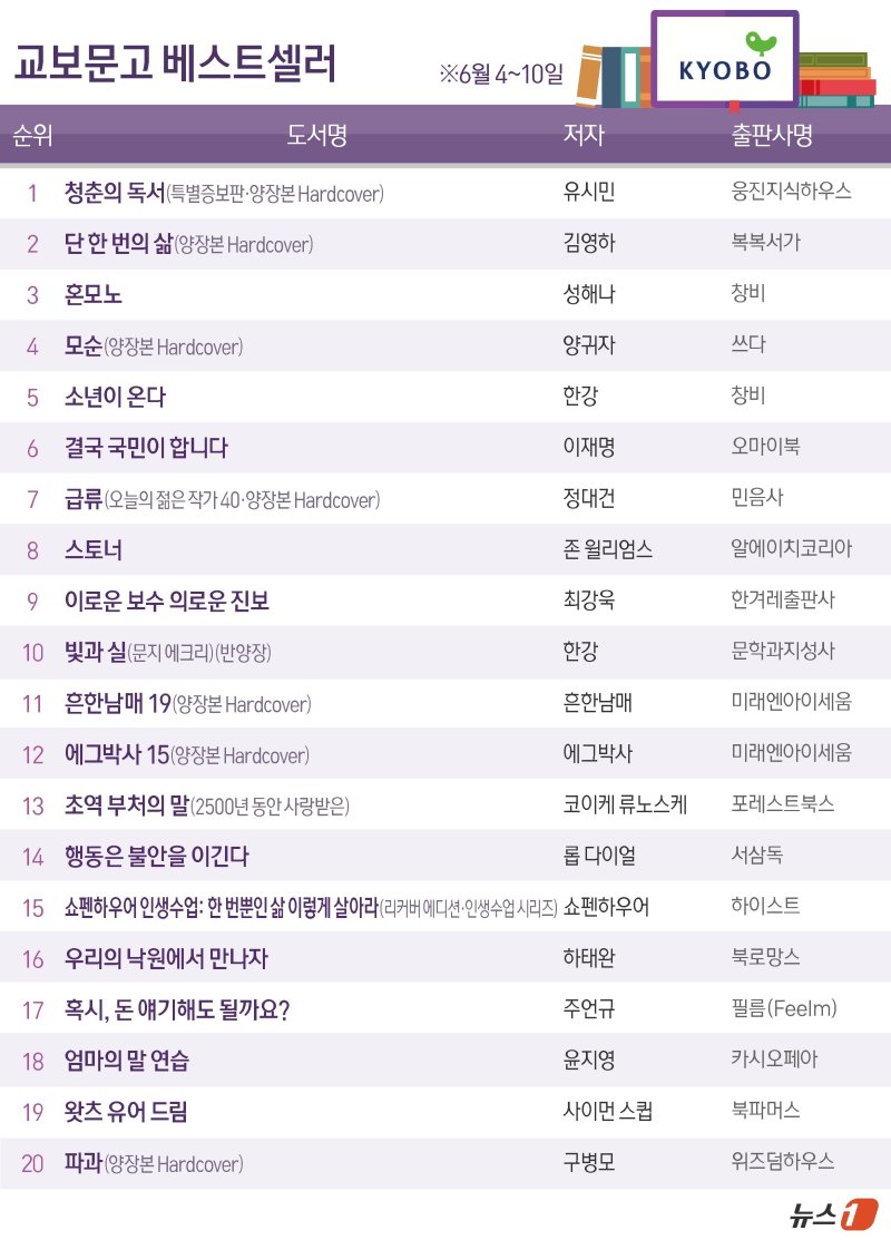 12일 교보문고가 발표한 종합 베스트셀러 집계(4일~3일)에 따르면, 유시민 작가의 '청춘의 독서'는 4주 연속 정상을 지켰다.