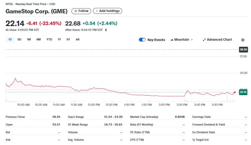 12일(현지시간) 뉴욕증시에서 게임스톱은 22.45% 폭락한 22.14달러를 기록했다.