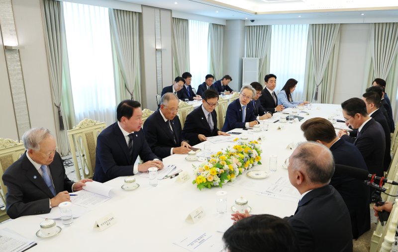 이재명 대통령, 경제단체·기업인 간담회 (서울=연합뉴스) 홍해인 기자 = 이재명 대통령이 13일 서울 용산 대통령실에서 6경제단체·기업인 간담회를 하고 있다. 2025.6.13 [대통령실통신사진기자단] hihong@yna.co.kr (끝)
