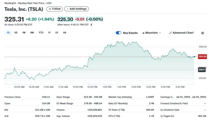 이날 뉴욕증시에서 테슬라는 1.94% 상승한 325.31달러를 기록했다.