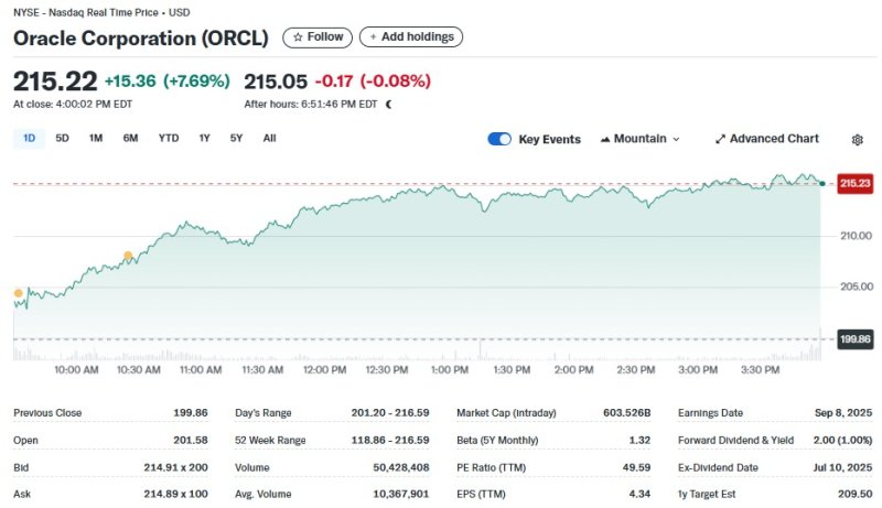 13일(현지시간) 뉴욕증시에서 오라클은 7.69% 급등한 215.22달러를 기록했다. 이는 사상 최고치다.