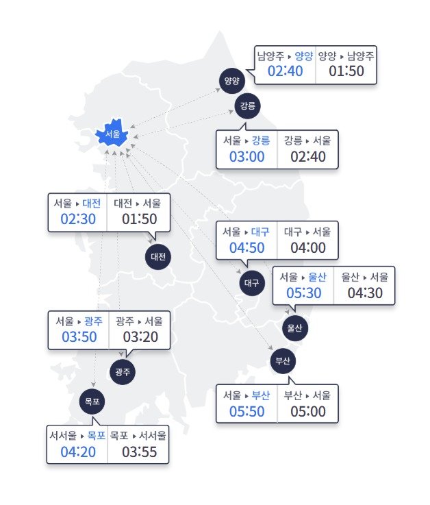 같은 시각 지방 도시에서 서울까지는 △부산 5시간 △울산 4시간 30분 △강릉 2시간 40분 △양양 1시간 50분(남양주 도착) △대전 1시간 50분 △광주 3시간 20분 △목포 3시간 55분(서서울 도착) △대구 4시간이다.