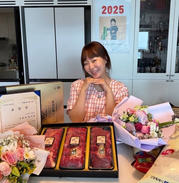 정주리는 표창장과 함께 한우, 쌀, 홍삼 등 선물을 받고 환한 미소를 지었다.