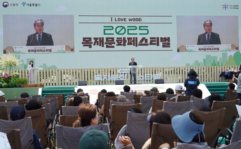 [파이낸셜뉴스] 임상섭 산림청장이 14일 서울 동작구 보라매공원에서 열린 ‘2025 목재문화페스티벌’ 개막식에서 축사를 하고 있다. 임 청장은 “기후위기 대응과 탄소중립 실천이 선택이 아닌 필수가 된 지금, 세계 여러 나라들은 대기 중의 탄소를 줄이는 해결방안으로 국산 목재 이용에 힘쓰고 있다”면서 “이번 축제를 통해 국민 누구나 탄소중립을 실천할 수 있는 생활 속 목재 이용이 더욱 활성화되길 기대한다"고 말했다. 산림청 제공