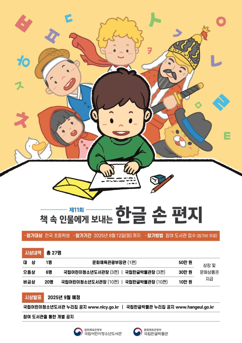 [서울=뉴시스]김주희 기자 = 국립어린이청소년도서관과 국립한글박물관이 공동 주최하는 '제11회 책 속 인물에게 보내는 한글 손 편지' 공모전이 8월12일까지 진행된다.