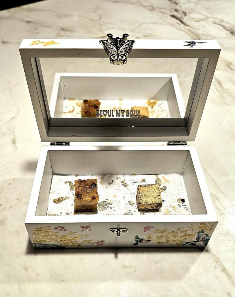 자개함을 열면 두 가지 디저트가 담겨 있다. 고소하게 구운 잣을 진한 생강 크러스트와 함께 조합한 구운 잣 파이 'Roasted Pine Nut Pie', 발효 풍미가 감도는 된장 캐러멜 인절미(Doenjang Caramel with Injeolmi) 등이다.