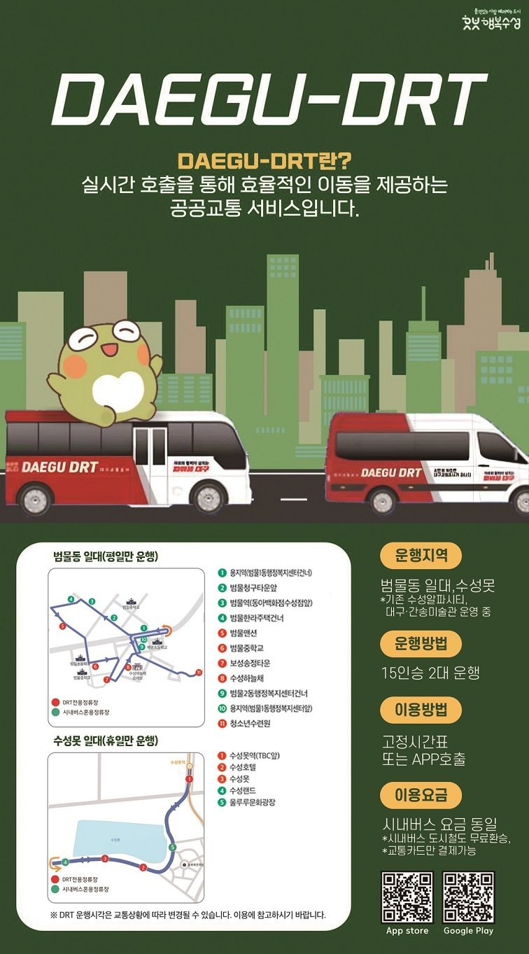 15인승 규모의 DRT은 평일 도시철도 3호선 용지역을 출발해 청소년수련원 등 범물동 일대를, 휴일에는 수성못역을 출발해 울루루문화광장 등 수성못 일대를 운행한다.