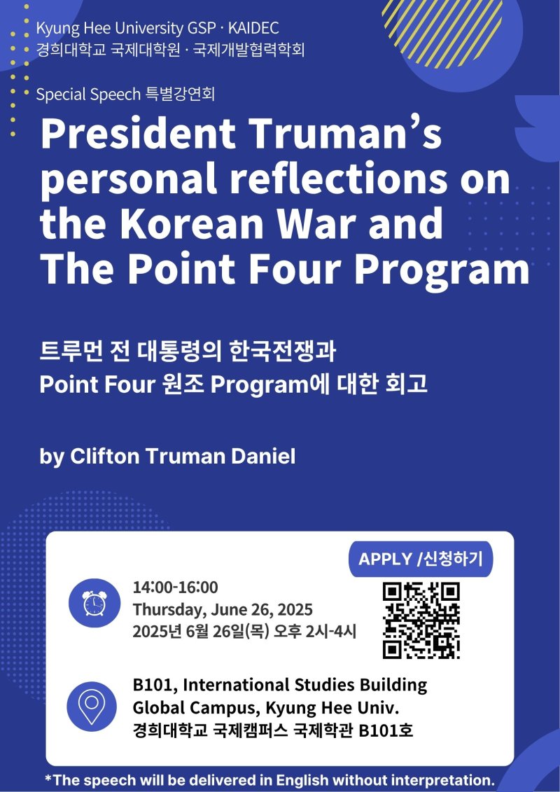 강연 주제는 '트루먼 대통령의 한국전쟁과 포인트 포 원조 프로그램에 대한 회고(President Truman’s Personal Reflections in the Korean War and The Point Four Program)'다.