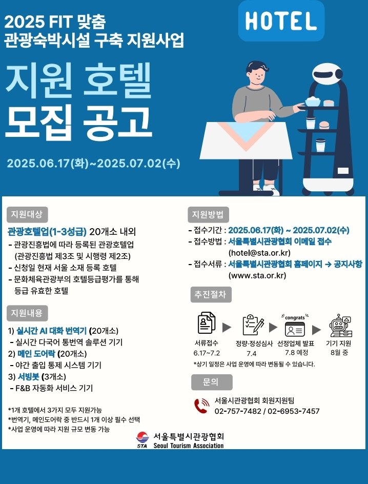 이번에 모집한 시설에는 △실시간 인공지능(AI) 통역기 △스마트 메인 도어락 △식음료(F&B) 서비스 자동화 서빙봇 △ 디지털 서비스 전화 교육 및 호텔 운영 컨설팅을 제공한다.