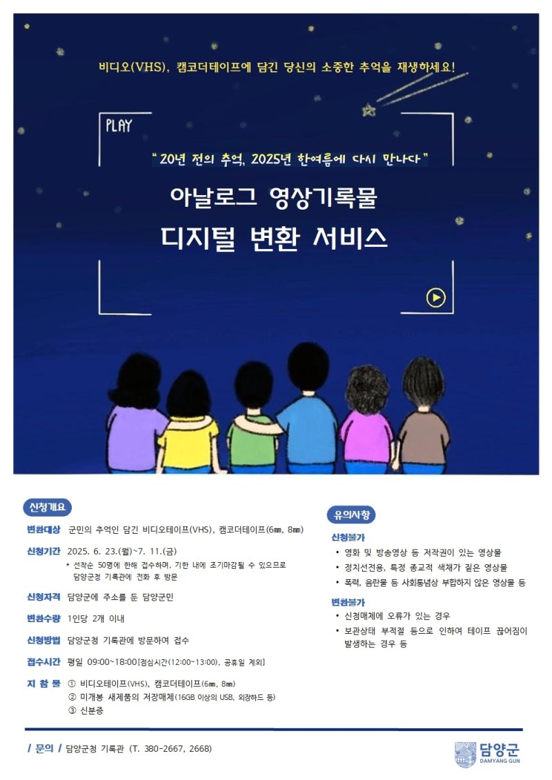 신청 대상은 담양군에 주소를 둔 군민으로, 변환할 테이프와 USB 또는 외장하드 등 저장매체, 신분증을 지참해 담양군청 미래성장동 2층 기록관을 방문하면 된다.