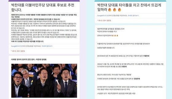 또 다른 내용의 서명서도 퍼지고 있다. '박찬대 당대표 타이틀을 차고 찬 데서 뜨겁게 일하라'는 제목의 이 성명서에도 "이재명 당대표와 찬대원대(원내대표)로 가장 호흡을 길게 맞춰왔다"며 "비상계엄과 탄핵 국면 속에서 당을 안정적으로 이끌어 내란 세력 탄핵을 완성 시키고, 대선 총괄 지휘로 국민주권 정부를 탄생시킨 주역"이라는 표현이 적혀있다.