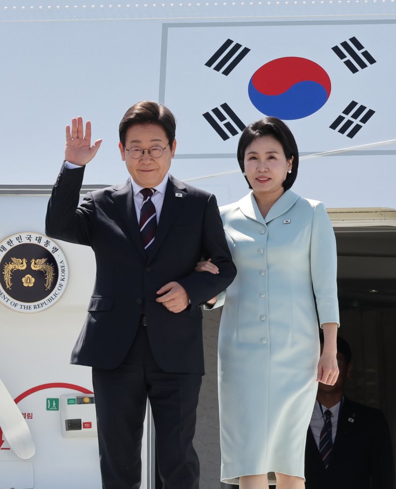 [캘거리=뉴시스] 최진석 기자 = 주요 7개국(G7) 정상회의에 참석하는 이재명 대통령이 16일(현지 시간) 캐나다 앨버타주 캘거리국제공항에 도착해 김혜경 여사와 공군 1호기에서 내리며 인사를 하고 있다. 2025.06.17. myjs@newsis.com [서울=뉴시스]고범준 최진석 김지은 김경록 기자 = 이재명 대통령이 16일(현지시간) 주요7개국(G7) 정상회의가 열리는 캐나다에 도착했다. 이 대통령은 1박3일 동안 캐나다에 머물며 취임 12일 만에 다자외교 데뷔전을 치른다.