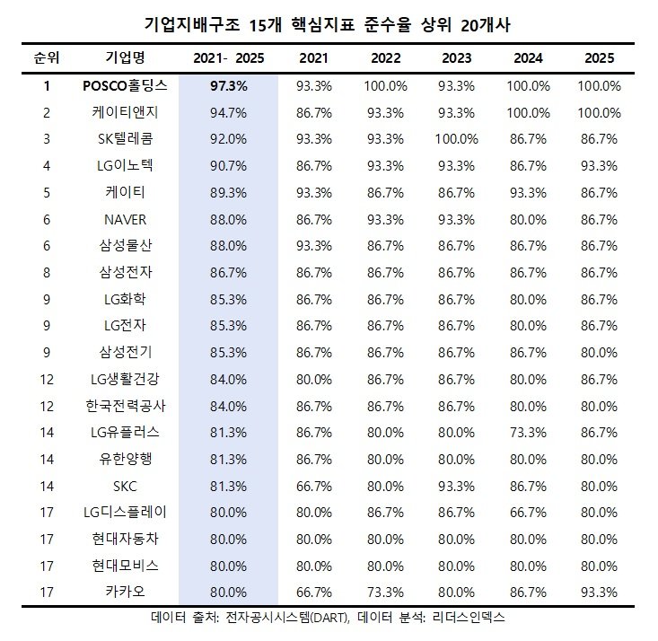 기업별로 보면 포스코홀딩스가 2019년 자산 2조원 이상 상장사 보고서 의무공시 도입 이후 2021·2023년을 제외하고는 전 지표를 모두 충족해 100% 준수율을 기록한 유일한 기업이다. KT&G는 2021년 86.7%, 2022년과 2023년에는 93.3%의 준수율을 보이다 지난해부터 2년 연속 100%를 기록하고 있다.