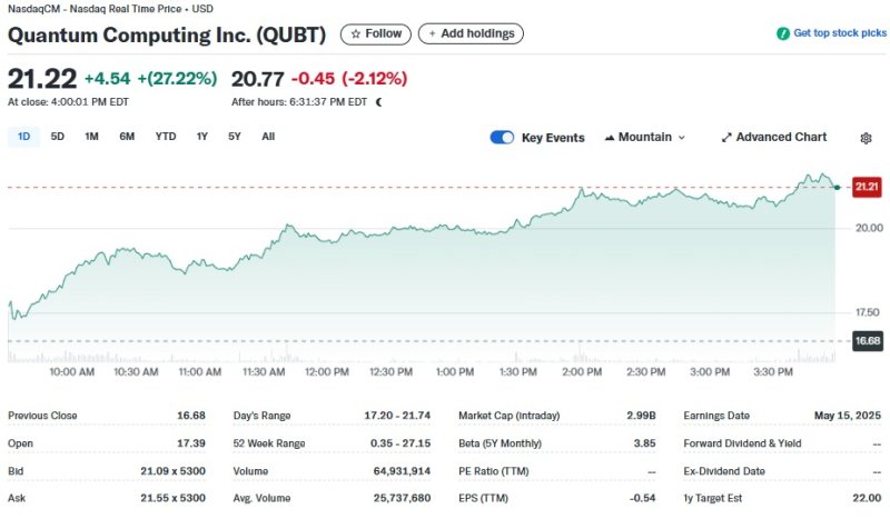 16일(현지시간) 뉴욕증시에서 퀀텀은 27.22% 폭등한 21.22달러를 기록했다.