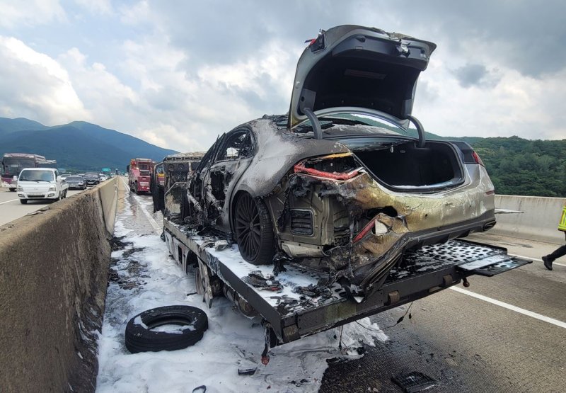 이날 화재로 탁송차량에 적재된 벤츠 1대가 전소해 소방서추산 2억4500여 만원의 재산피해를 냈다.