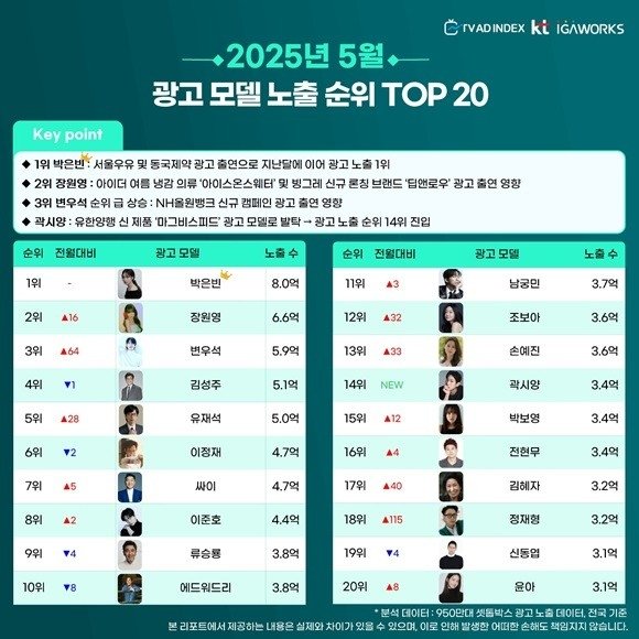 3위는 배우 변우석으로 5억9천만회 노출돼 전월보다 64계단이나 올랐다. NH올원뱅크 신규 캠페인 광고에 출연한 영향이 컸던 것으로 분석됐다.