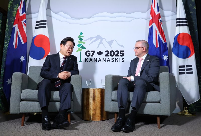 [캘거리=뉴시스] 최진석 기자 = 주요 7개국(G7) 정상회의 참석차 캐나다를 방문한 이재명 대통령이 16일(현지 시간) 캘거리 한 호텔에서 앤서니 앨버니지 호주 총리와 한-호주 정상회담을 하고 있다. 2025.06.17. myjs@newsis.com [서울=뉴시스]고범준 김지은 최진석 기자 = 주요 7개국(G7) 정상회의 참석을 위해 캐나다에 도착한 이재명 대통령은 16일(현지시간) 남아공 대통령, 호주 총리와 연쇄 정상회담을 했다. 첫 번째 공식 일정이다.