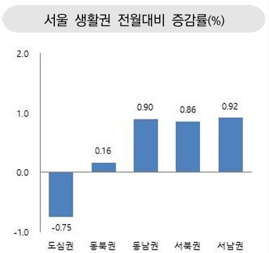 서울 공동주택의 매매가격도 4개월 만에 하락 전환하며 0.2% 하락했다. 아파트는 종로구·용산구 등이 포함된 도심권(-0.75%) 매매가격이 떨어지며 0.14% 하락한 것으로 나타났다. 연립·다세대 주택도 전월 대비 0.32% 떨어졌다. 양천구와 영등포구 등이 포함된 서남권(0.92%)이 가장 높은 상승률을 기록했으며 강남3구가 포함된 동남권(0.9%)이 그 뒤를 이었다. 마포구 등 서북권은 0.86%), 노·도·강(노원·도봉·강북)이 포함된 동북권은 0.16% 상승했다.