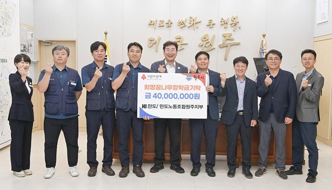 17일 원주시에 따르면 해당 기업의 원주공장과 노조 원주지부는 전날 원주시청의 원강수 원주시장 집무실을 찾아 제12회 희망꿈나무 장학금 4000만 원을 전달했다.
