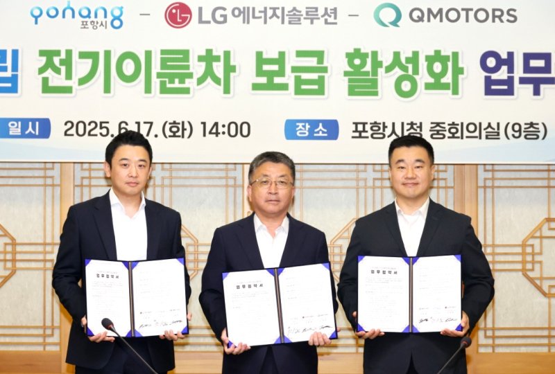 [포항=뉴시스]송종욱 기자 = 경북 포항시는 17일 중회의실에서 ㈜LG에너지솔루션·㈜큐모터스와 '탄소중립 전기 이륜차 보급 활성화를 위한 업무 협약(MOU)’을 맺었다고 밝혔다.