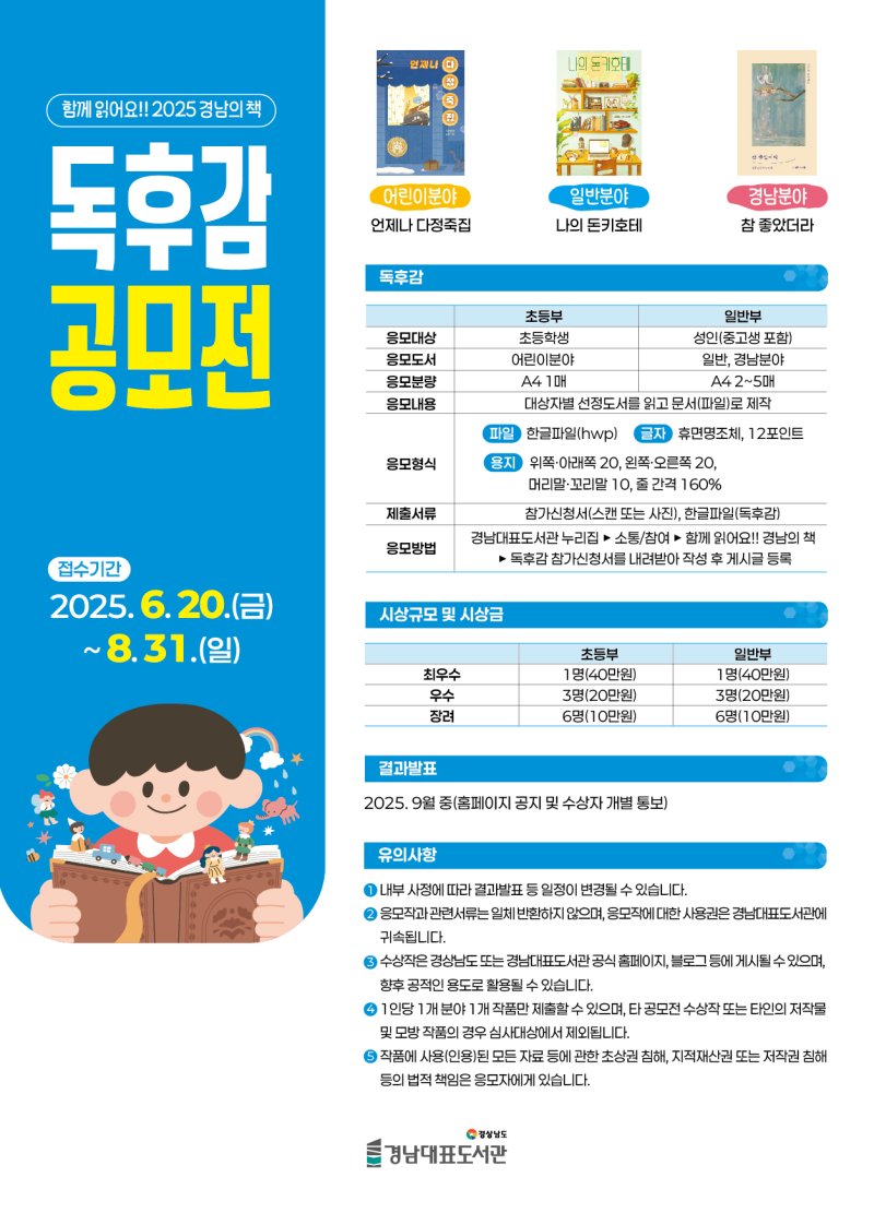 신민철 경남대표도서장은 "독후감 공모전을 통해 올해 경남의 책을 도민 모두가 함께 읽고 공감대를 형성하는 계기가 되길 바란다"고 말했다.