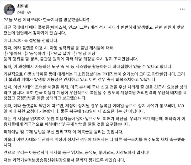 최 위원장은 "메타 측이 이용자들에게 적극적으로 피해예방과 구제 방법을 알릴 것을 요구했다"며 "이번 사태와 무관하게 계정이 정지된 경우 더 빠른 복구조치를 하도록 재차 촉구했다"고 덧붙였다.