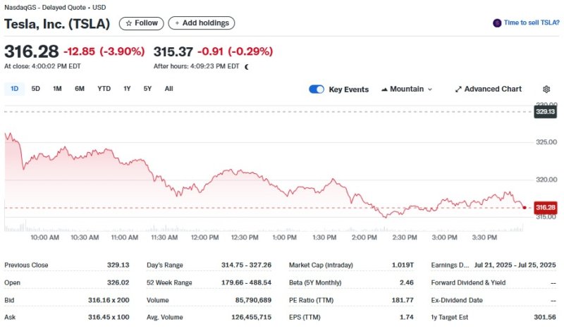 17일(현지시간) 뉴욕증시에서 테슬라는 3.90% 급락한 316.28달러를 기록했다. 이로써 시총도 1조190억달러로 집계돼 시총 1조달러에 턱걸이했다.