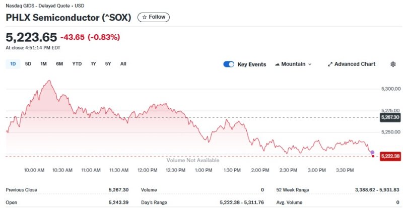 17일(현지시간) 뉴욕증시에서 반도체지수는 0.83% 하락한 5223.65포인트를 기록했다.