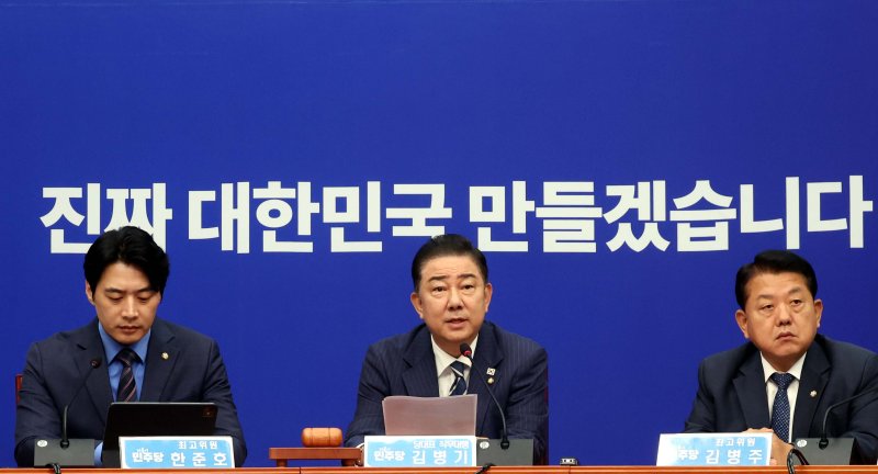 [서울=뉴시스] 이재우 남정현 한재혁 기자 = 더불어민주당은 18일 김민석 국무총리 후보자를 겨냥한 국민의힘의 의혹 제기를 '맹목적 정치 공세'로 규정하고 경제위기 극복 등을 위해 총리 인선에 협조하라고 촉구했다.
