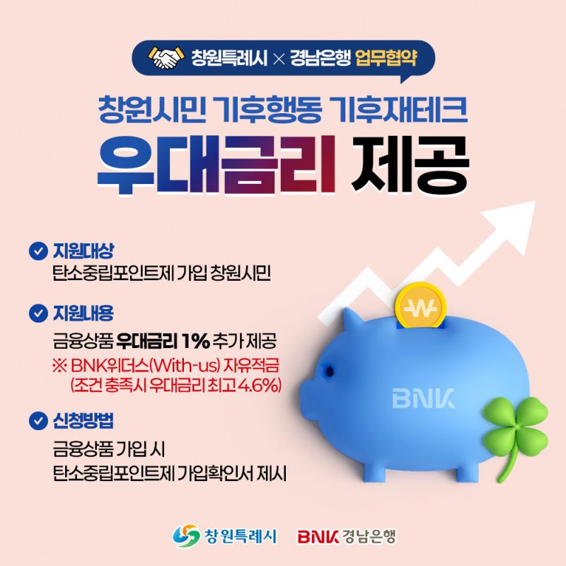탄소중립포인트제에 가입한 시민이 경남은행의 BNK위더스(With-us) 자유적금 상품 가입 시 기본 금리에 1% 추가 금리를 제공받을 수 있다. 가입 조건을 모두 충족할 경우 최대 4.6%까지 우대 금리를 받을 수 있다.
