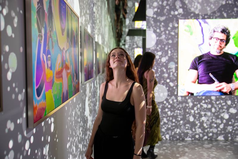 삼성전자가 19일(현지시간)부터 22일까지 스위스 바젤에서 열리는 세계 최대 아트 페어 '아트 바젤 인 바젤 2025'에 디지털 아트 체험 공간 삼성 라운지 '아트큐브'를 마련했다. 한 관람객이 삼성이 설치한 미술 작품들을 살펴보고 있다. 삼성전자는 전 세계 42개국 280여 개 갤러리가 참여한 이번 아트페어의 공식 디스플레이 파트너사다. 삼성전자 제공