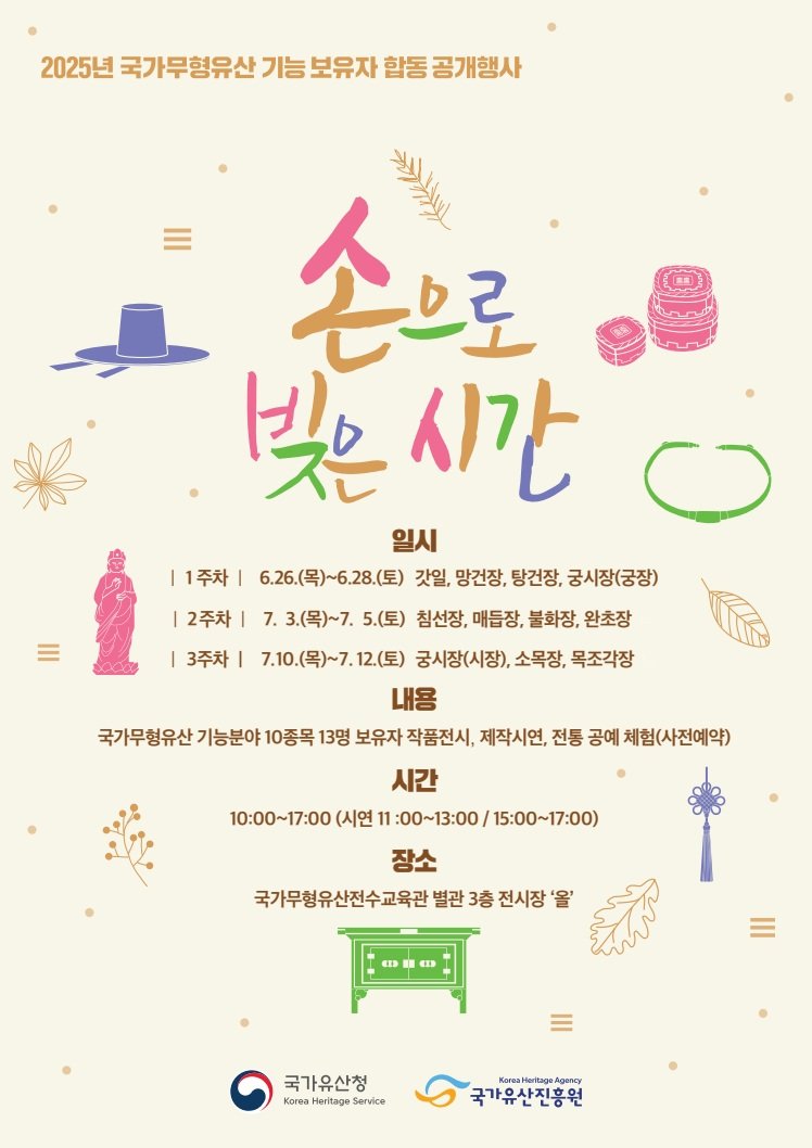 국가유산진흥원은 오는 26일부터 7월 12일까지 국가무형유산 기능보유자 합동공개행사 '손으로 빚은 시간'을 국가무형유산전수교육관 별관 3층 전시장 '올에서 개최한다고 밝혔다.