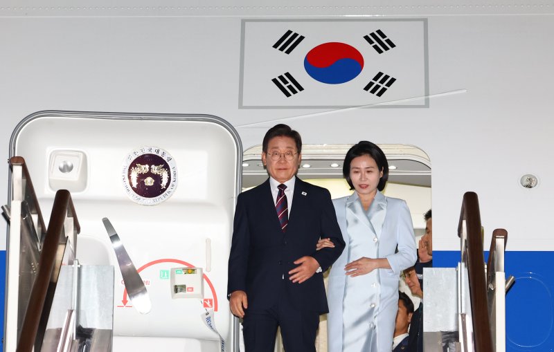 [성남=뉴시스] 최진석 기자 = 이재명 대통령과 부인 김혜경 여사가 19일 주요 7개국(G7) 정상회의 참석을 마치고 성남 서울공항에 도착해 공군 1호기 내리고 있다. 2025.06.19. myjs@newsis.com [서울=뉴시스]고범준 김지은 최진석 조재완 기자 = 주요 7개국(G7) 정상회의 참석을 위해 캐나다를 방문했던 이재명 대통령이 19일 귀국했다.