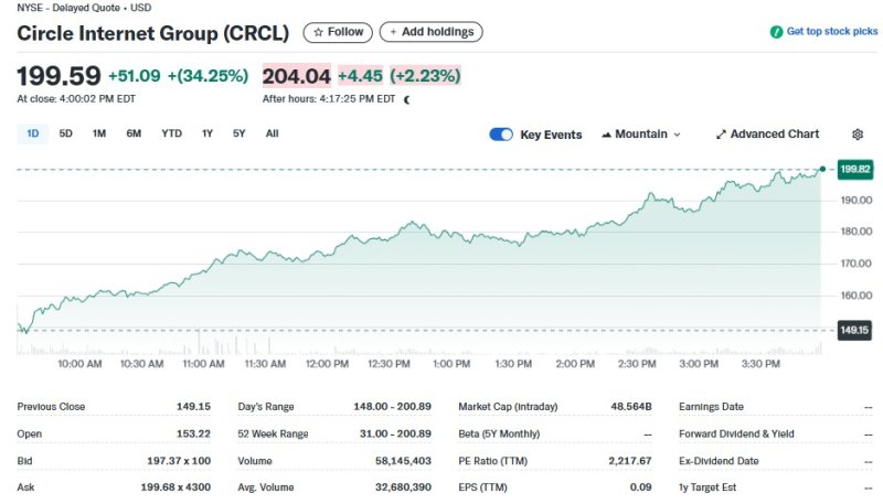 18일(현지시간) 뉴욕증시에서 서클은 34.25% 폭등한 199.59달러를 기록했다. 이로써 서클은 지난 5일 상장이 이후 무려 542% 폭등했다.