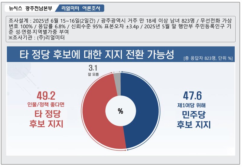 [광주=뉴시스]맹대환 기자 = 광주시민 2명 중 1명은 내년 제9회 전국동시지방선거에서 인물이나 정책을 보고 더불어민주당이 아닌 다른 정당 후보를 지지할 수 있다는 의견을 나타냈다.